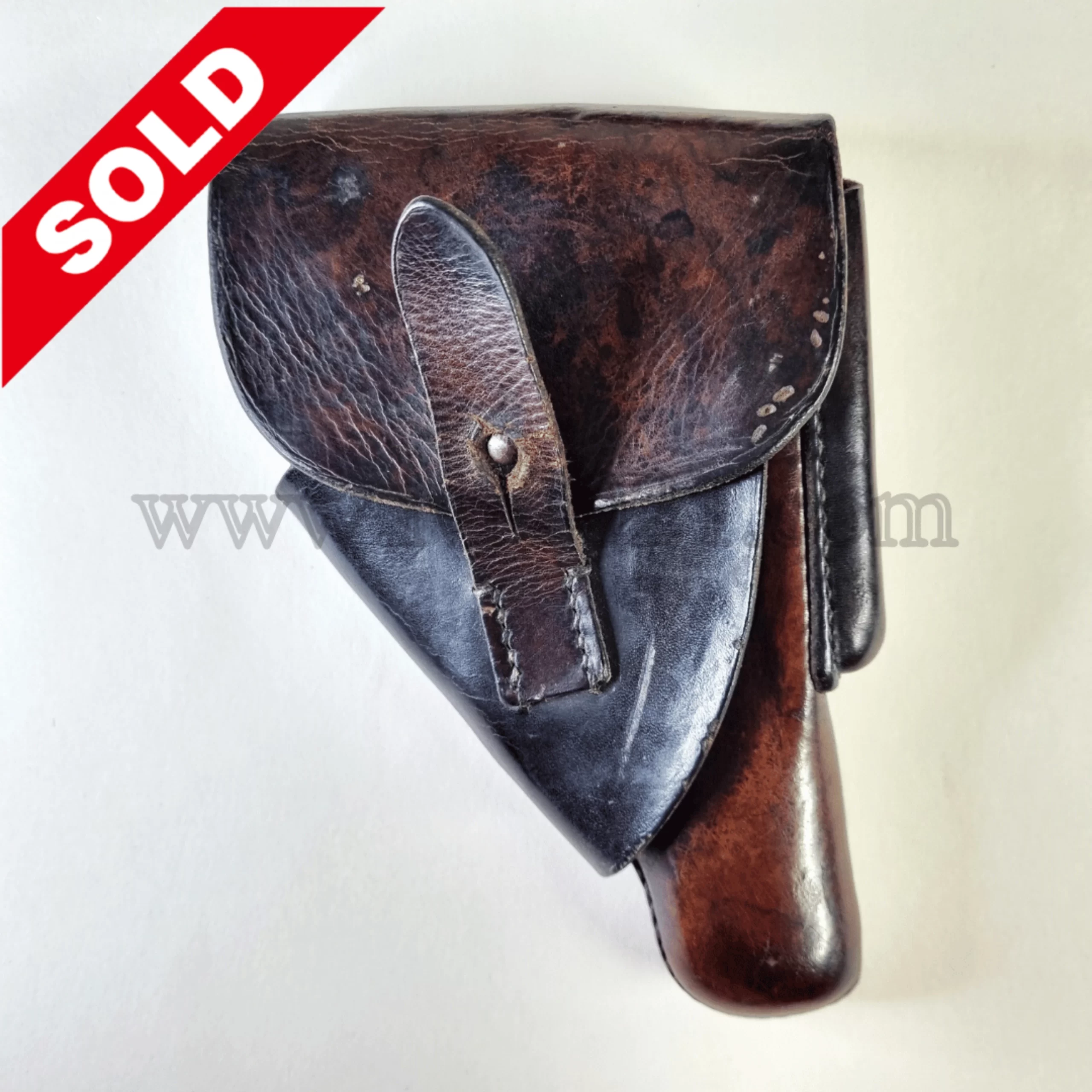 Nice condition original Akah Walther PPK Leading Edge holster from WW2. It has a DRGM and Akah maker mark stamped under the closure strap. The dark red leather is strong and fairly firm with no notable flaws. The stitching is all tight and original with no stitching flaws. A great collectible holster. The interior leather is clean.