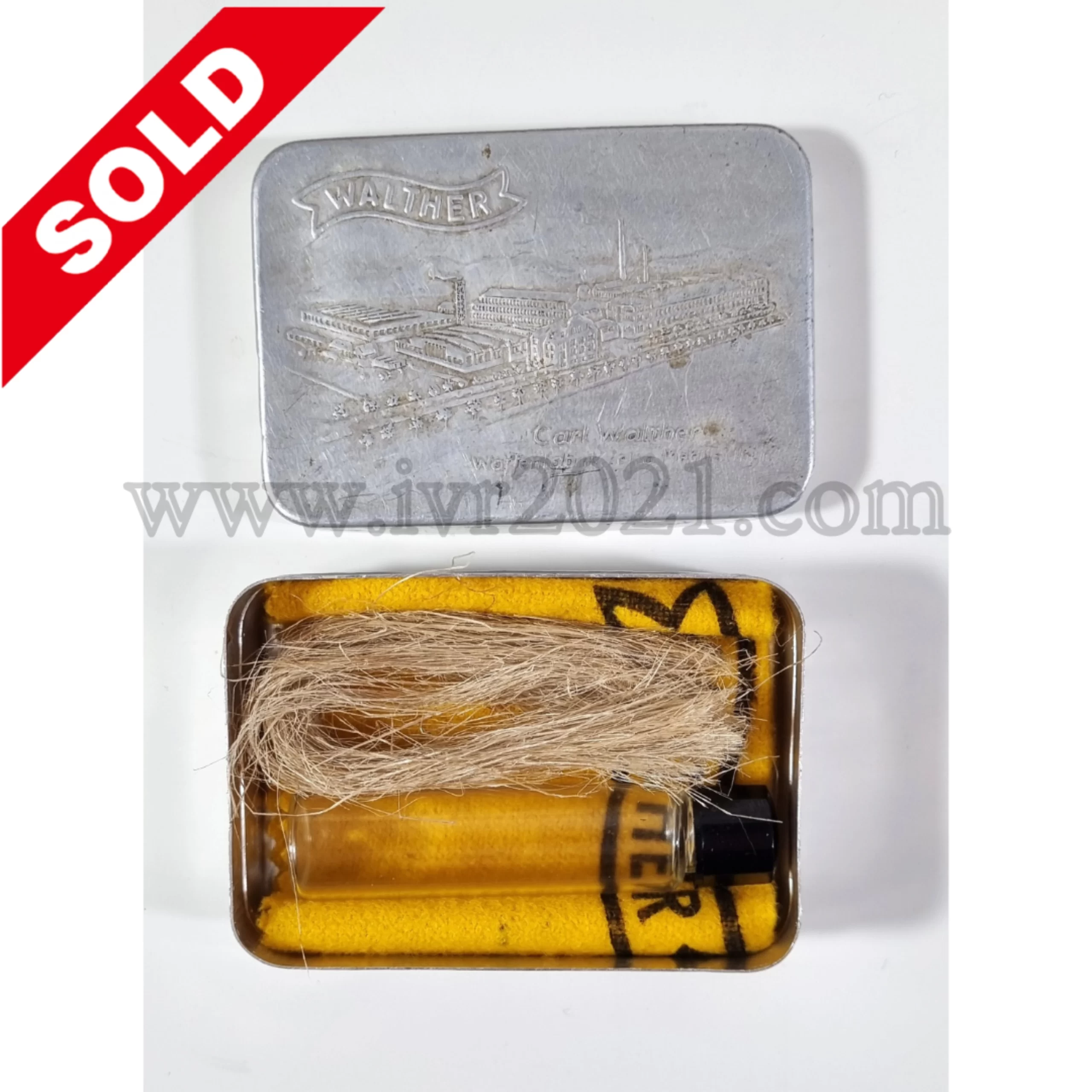Good condition cleaning tin for Walther PP and PPK box with complete interior consisting of horsehair, cleaning cloth and oil vial!. Full factory stamping.