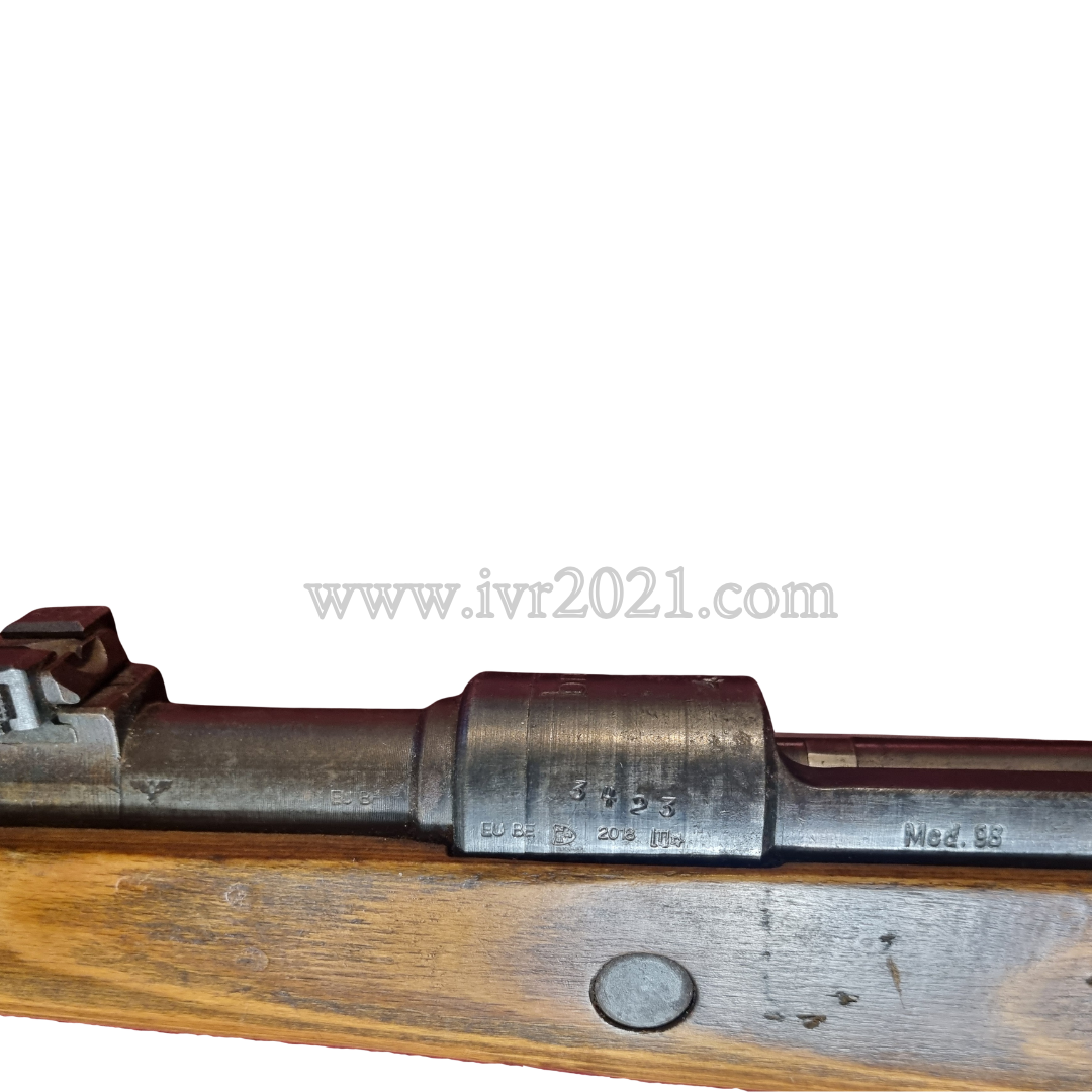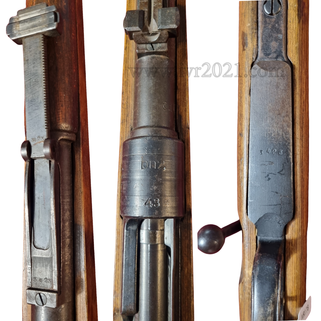 In 1943 the Waffen SS ordered 10.000 k98’s at the bnz factory. The serialnumber on these rifles did not have the lettercode. The rifles also lacked final WaA proof marks, because the guns were ordered for the SS and not for the Wehrmacht. Another version of the SS k98 is virtually identical to this version but with the S rune on the receiver. Because the final WaA marks and lettercode in the serial number are missing, this k98 can be concluded to be a SS gun without any doubt. The gun is fully matching. The bolt is also matching but to itself and not the rest of the rifle. This is an early EU deco, which means it is fully movable and can dry fire. EU certificate is included.