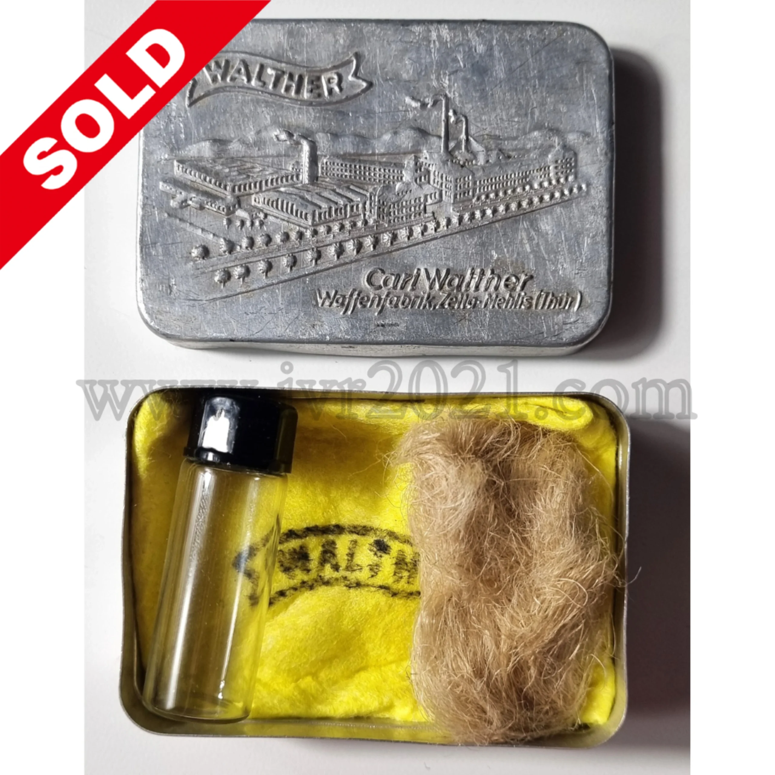 Nice original cleaning tin from the Walther factory in Zella Mehlis. The interior items are reproduction but basically identical to the original items. It includes the oil vial, walther stamped cleaning rag and horsehair.