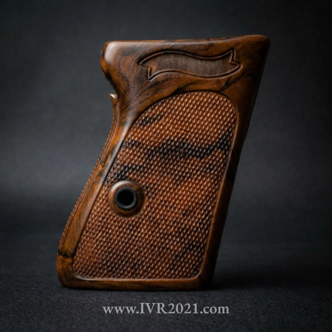 One piece ww2 style inspired grips for the Walther ppk in mottled brown. The brown mottled version has 3 distinct colors in it. Brown, black and a little red. The red was taken out all together in later examples, while going to all black near the end of the war. All steel inserts are present. The IVR logo is also present on the inside of the grip to easily identify the grip as a non original. The best grips available made by IVR2021.